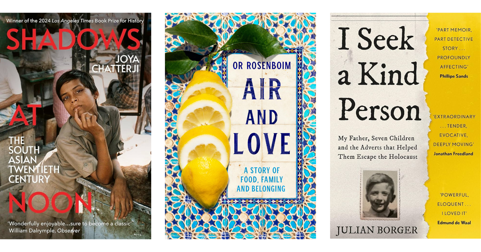 I recommend three ingenious blends of serious historical research, family history and affecting personal memoir. Moving from east to west: first, Joya Chatterji’s Shadows At Noon: The South Asian Twentieth Century (Vintage), an unorthodox history of South Asia in the 20th century interwoven with the author’s family memories, favourite films and sweet treats. Then, Or Rosenboim animates the women in her Bukharan merchant family through their recipes as they move from Samarkand to Jerusalem in Air and Love: A Story of Food, Family and Belonging (Picador). And finally, Guardian journalist Julian Borger’s I Seek a Kind Person: My Father, Seven Children and the Adverts That Helped Them Escape the Holocaust (John Murray) tracks the fates of eight Jewish children in Vienna whose parents sought refuge for them in Britain via adverts in the Manchester Guardian in the summer of 1938 – one of those children was his father and one of them, I confess, was mine.